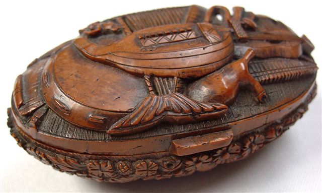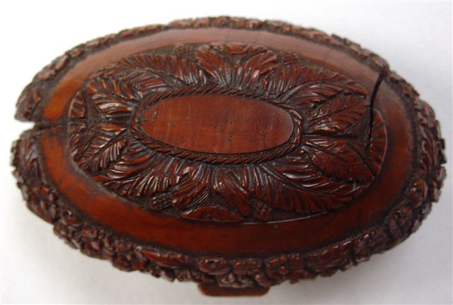 TABATIÈRE en noix de corozo, de forme ovale, à décor sculpté sur le couvercle d'instruments de musique. Le pourtour et le fond sculptés de guirlandes fleuries et feuillagées. XVIIIème. Haut. 3,5, Long. 7,5, Larg. 4,5 cm. (accdts et rest.)