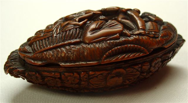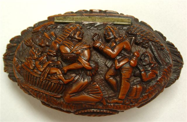 TABATIÈRE en noix de corozo, de forme ovale, à décor sculpté sur le couvercle d'une scène illustrant l'Annonce aux bergers. Le pourtour et le fond sculptés à décor de d'instruments de musique, fleurs et feuillages. XVIIIème. Haut. 3,5, Long. 8, Larg. 5 cm. (petits mques)