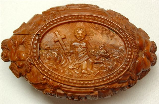 TABATIÈRE en noix de corozo, de forme ovale, à décor sculpté sur le couvercle d'une scène représentant la Nativité. Le pourtour et le fond sculptés figurant le Christ enfant et l'Agneau Pascal, entouré des attributs de l'Église chrétienne. XVIIIème-XIXème. Haut. 3, Long. 9, Larg. 5,5 cm. (fentes)