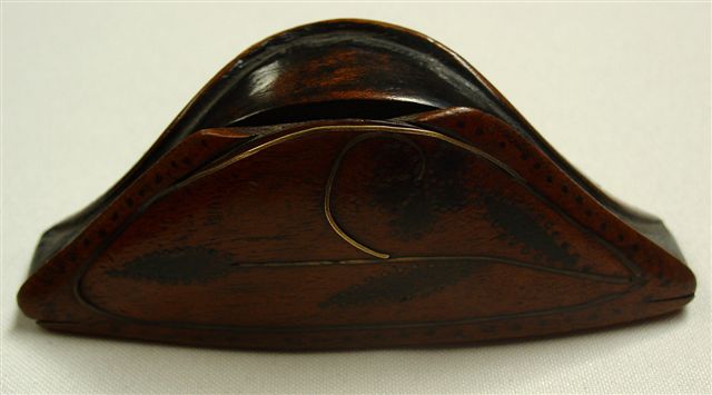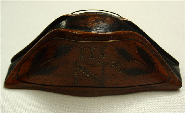 TABATIÈRE en bois naturel en forme de chapeau napoléonien à décor incrusté et gravé de fleurs et inscriptions : "III N". XIXème. Haut. 4, Long. 10, Larg. 3,5 cm.
