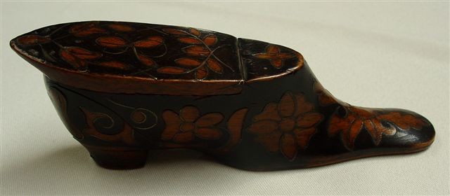 TABATIÈRE en bois naturel en forme de sabot à décor teinté et incrusté de fleurs et feuillages stylisés. Inscriptions "Souvenir". Haut. 5, Long. 14, Larg. 3 cm.