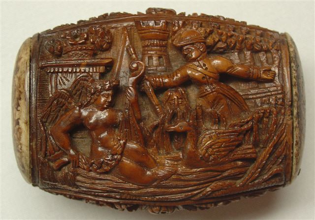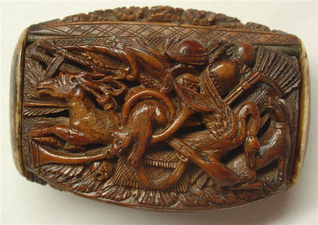 TABATIÈRE en noix de corozo, de forme rectangulaire, à décor sculpté sur le couvercle d'une scène représentant des attributs liés au domaine de la chasse : gibier, chien, chevreuil, fusil, trompe, cor, etc. Sur le fond figure une scène animée d'un piqueux et d'une déesse au milieu d'un étang, habitations en arrière-plan. Le pourtour est constitué de plaques teintées en ivoire-os. XIXème. Haut. 4, Long. 7, Larg. 5 cm.