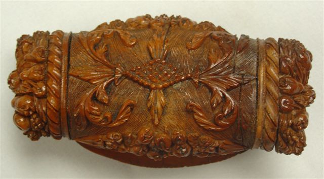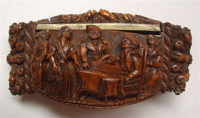TABATIÈRE en noix de corozo, de forme oblongue, à décor sculpté sur le couvercle d'une scène figurant un groupe d'hommes et de femmes en habits révolutionnaires. Le pourtour et le fond sculptés de feuillage et de fleurs. Fin XVIIIe-début XIXe. Haut. 4, Long. 10, Larg. 5 cm.