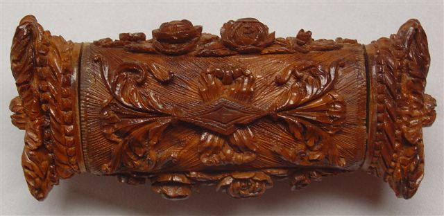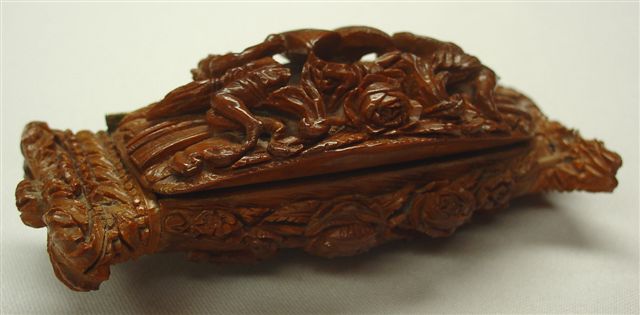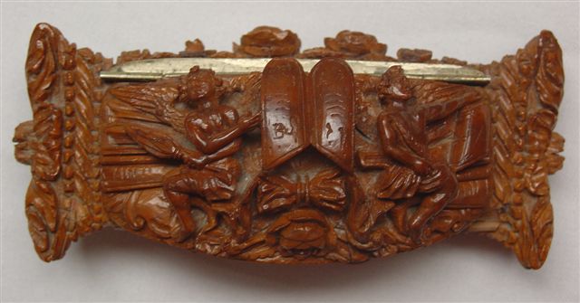 TABATIÈRE en noix de corozo, de forme rectangulaire, à décor sculpté sur le couvercle rerpésentant deux anges entourant la Bible. Le pourtour et le fond sont ornés de roses et feuillage. XVIIIe-XIXe. Haut. 4, Long. 11, Larg. 5 cm.