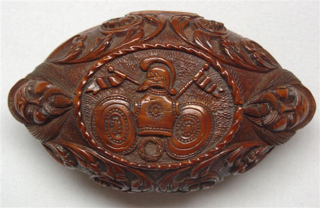 TABATIÈRE en noix de corozo, de forme ovale, à décor sculpté sur le couvercle d'une scène antique figurant la capitulation ? Le fond est orné d'une cuirasse, casque, boucliers et étendards et le pourtour de mascarons et rinceaux. XVIIIe-XIXe. Haut. 3,5, Long. 9, Larg. 5 cm.