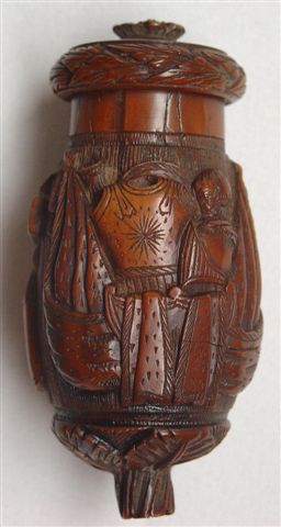 TABATIÈRE ? en noix de corozo, de forme ovoïde, à décor sculpté représentant d'un côté casque, cuirasse et étendards, et de l'autre instruments de musique et parchemin. Couvercle à vis orné d'un tore de laurier et percé de 5 orifices. XVIIIe-XIXe. Haut. 8 cm.