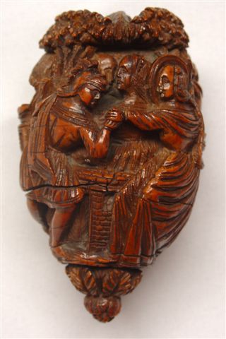 TABATIÈRE en noix de corozo, de forme ovoïde, à décor sculpté de scènes galantes, tête stylisée et fleurs. XVIIIe-XIXe. Haut. 8,5 cm. (mques)
