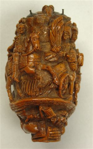 TABATIÈRE en noix de corozo, de forme ovoïde, à décor sculpté d'une scène de bataille napoléonienne, figurant Napoléon entouré de ses officiers à cheval et soldats faisant le siège. Fin XVIIIe-début XIXe. Haut. 7,5 cm. (pet. mques).
