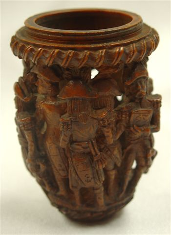 TABATIÈRE ? en noix de corozo, de forme ovoïde, à décor sculpté et ajouré représentant Napoléon tournant le dos et montrant une direction, entouré d'officiers et soldats. Fin XVIIIe-début XIXe. Haut. 5 cm. Incomplet dont couvercle.