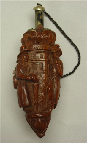 TABATIÈRE en noix de corozo, de forme ovoïde, à décor sculpté représentant deux hommes, l'un tenant un paraluie, l'autre une canne, tête stylisée et rinceaux. Travail anglais ? XVIIIe-XIXe. Haut. 10 cm.