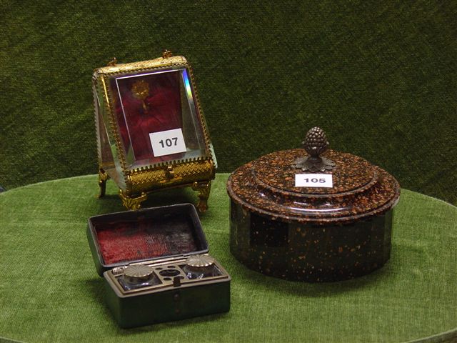 COFFRET à BIJOUX en métal doré et verres biseautés, faisant vitrine pour porte montre. Intérieur capitonné cerise.