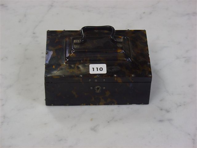 BOÎTE en écaille de tortues de forme rectangulaire avec poignée sur le dessus. Haut. 5,5, Long. 14,5, Larg. 10,5 cm.