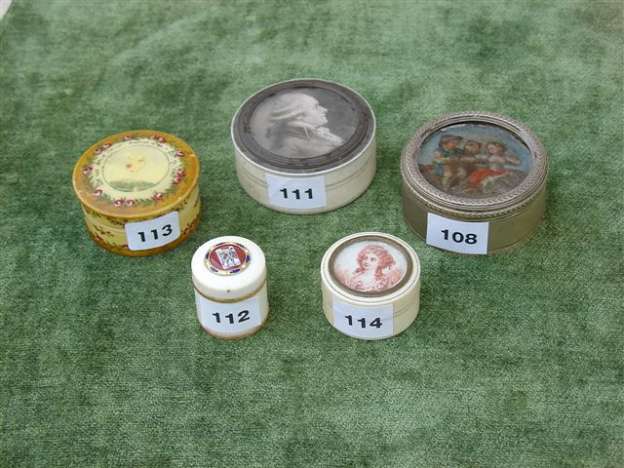 BOITE ronde en ivoire décorée d'un portrait de jeune femme, cerclé de métal. Diam. 4 cm.