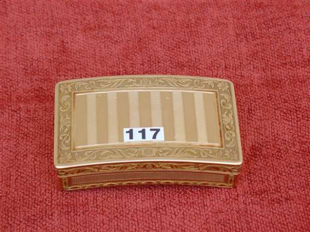 BOÎTE de forme rectangulaire et bombée en or jaune gravée de filets dans des encadrements de feuillages. L'intérieur du couvercle à charnière, monogrammé. (petits accidents).