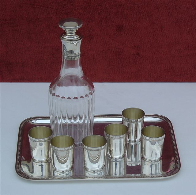 SERVICE à LIQUEUR en argent, à décor de feuilles d'eau, comprenant 6 GOBELETS à liqueur, CARAFE en cristal et bouchon argent, PLATEAU de service. Poinçon Minerve. Poids : 140 g.
