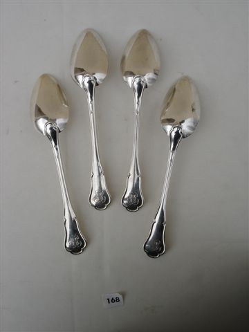 4 CUILLÈRES de TABLE en argent à décor de double filets. Monogrammes. Poinçon Minerve. Poids : 335 g.
