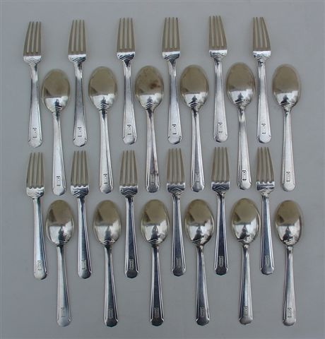 12 COUVERTS de TABLE en argent à décor de filets, style Art Déco. Monogrammes D.R. Poinçon Minerve. Poids : 1200 g.