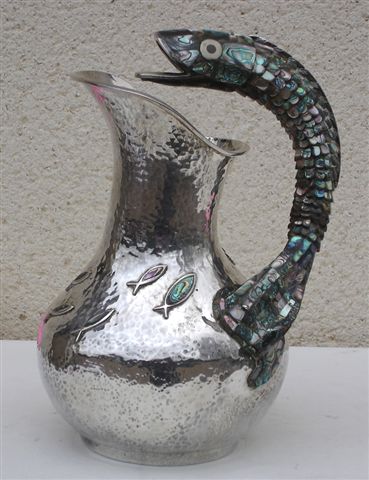 AIGUIÈRE en argent martelé, à large panse et long col, à mi-corps, appliquée d'un banc de poissons stylisés, ornés de navettes en nacre, l'anse mouvementée, également stylisée d'un poisson plus important, dont la tête et la queue sont ornées, comme les écailles qui recouvrent son corps, de plaquettes de burgau.