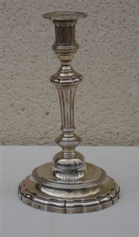 BOUGEOIR en argent posant sur une base ronde et mouvementée gravée de filets. Le fût et le binet à pans. L'ombilic monogrammé postérieurement. Avec sa bobèche. (réparations).