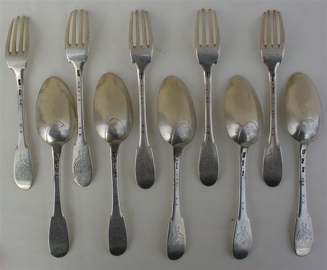 5 COUVERTS de table en argent, modèle uniplat chiffré dans un médaillon. Dijon, XVIIIème. Maître-Orfèvre DUMONT. Poids 675 g.