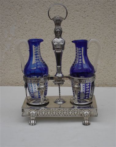 HUILIER VINAIGRIER. Monture en argent, base rectangulaire ajourée de palmettes stylisées enfermées dans des coeurs reposant sur 4 pieds griffes à muffles de lions, surmontée de porte-carafes à décor de caryatides et frise de feuilles. Fût en gaine terminé par un buste de caryatide janiforme supportant une corbeille de fruits, prise anneau.