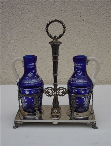 HUILIER VINAIGRIER. Monture en argent, base rectangulaire reposant sur 4 pieds griffes, surmontée de porte-carafes à décor de palmettes et frise de rais de coeur. Fût lotiforme et rang de perles, prise anneau perlé. Empire. Poinçon au deuxième Coq (1809-1819). Hauteur : 30,5 cm. Poids : 730g