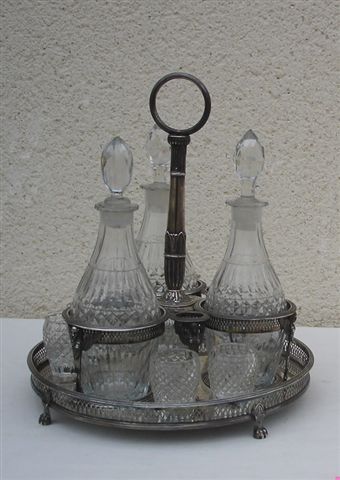 SERVICE À LIQUEUR en argent. Base circulaire reposant sur 4 pieds griffes, galerie ajourée, supportant 3 Porte-carafes aux sphinges ailées. Fût lotiforme terminées par une prise en forme d'anneau godronnée, avec ses trois carafes et six gobelets en cristal taillé. Empire.