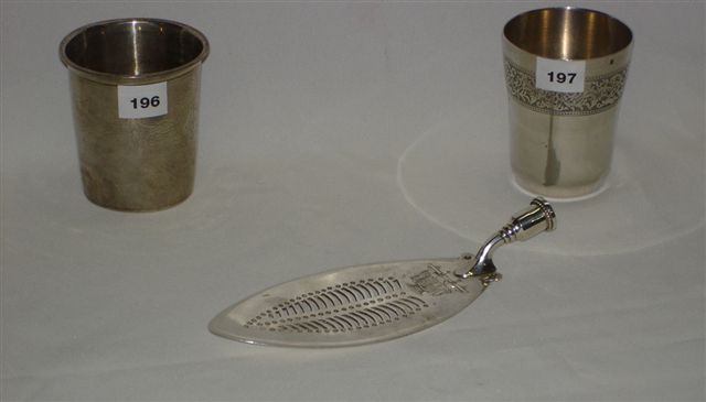 PELLE À GATEAU armoriée en argent, spatule à décor ajouré de feuilles d'eau. ODIOT, Paris. Poinçon Vieillard (1819-1838). Poids : 120 g (manque le manche).