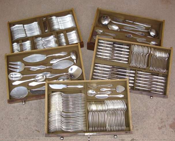 MÉNAGÈRE en métal argenté ERCUIS, comprenant 127 pièces : 11 couverts de table, 1 cuillère et 12 couteaux de table, 12 couverts à dessert, 12 couteaux à dessert, 8 cuillères à café, 11 fourchettes et 12 couteaux à poisson, 11 fourchettes à huître, 1 louche, 1 pelle à tarte, 1 manche à gigot, couvert à salade, 2 cuillères à servir, 1 cuillère à arroser, 1 saupoudreuse, service à hors-d'oeuvres comprenant 1 cuillère à olives, 2 fourchettes, 1 pelle à servir et 1 pelle coupante. Décor d'acanthes et coquille. Style Louis XV.