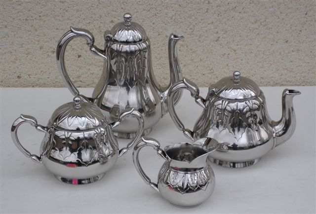 Service à THÉ-CAFÉ en métal argenté à décor de feuillages, comprenant cafetière, théière, sucrier, pot à lait. Christofle.