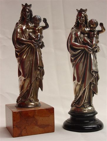 NOTRE DAME de la GARDE. 2 statuettes en bronze argenté, signées "LEQUESNE SC.". XIXeme. L'une a un socle en bois avec inscriptions "M.P. 9 juillet 1876", l'autre a un socle en marbre. Haut. 24 cm.