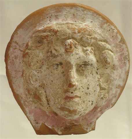 ANTÉFIXE. Terre cuite avec engobe et polychromie rose et rouge. Tête de méduse. Béotie. IV-IIIème avant JC. Haut. 12,5 cm.