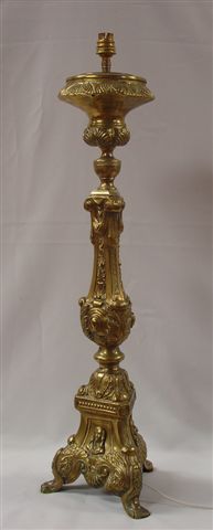 PIQUE-CIERGES en métal doré repoussé à décor de feuillages, coquilles et la Sainte Famille. Piètement tripode terminé en volute. Electrifié. Haut. 75 cm.