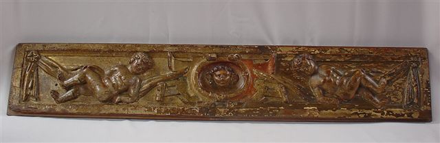 PANNEAU en bois sculpté et doré polychrome à décor d'Amours et mascaron. Travail ancien. 115 x 20 cm.