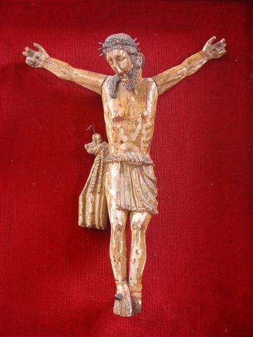 CHRIST en bois sculpté polychrome et traces de dorure. Travail espagnol ancien. Haut. 33 cm (mques doigts)