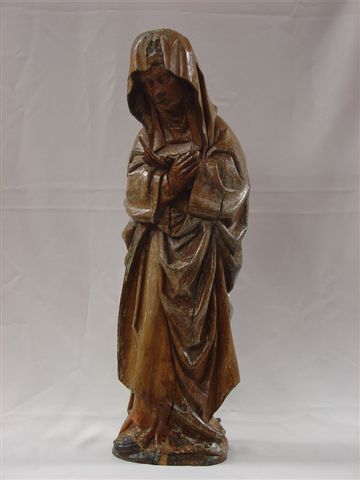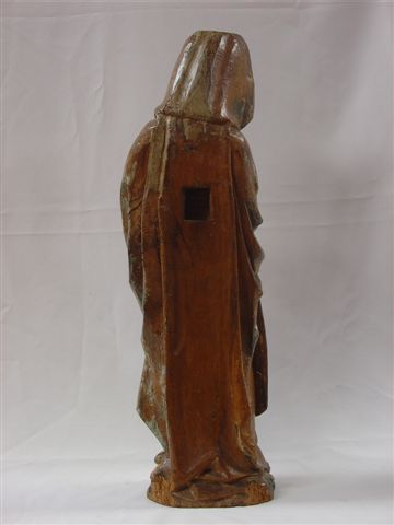 VIERGE de calvaire en bois sculpté, traces de polychromie, avec cavité à relique. Haut. 68 cm.