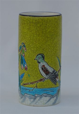 VASE rouleau. Décor d'un oiseau sur une berge, sur fond jaune craquelé (D 687 manuscrit).