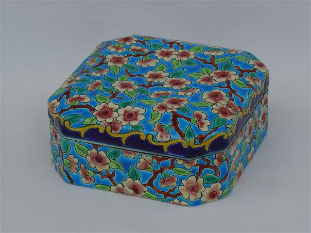 BOÎTE carré à pans coupés. Décor plein de fleurs de pommier sur fond bleu. Marque manuscrite D 1885. Couvercle à bordure bleu foncé et volutes jaunes.