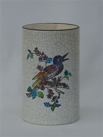 VASE rouleau. Décor d'un oiseau polychrome branché sur fond crème craquelé (D 49 manuscrit).