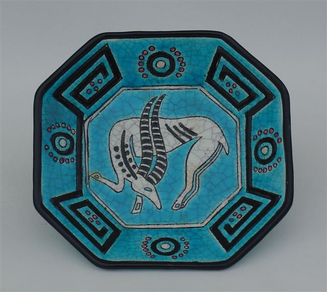 CENDRIER. Décor géométrisant d'un cervidé stylisé couché sur fond turquoise craquelé. Pans ornés de grecques émaillées noir dans les angles.