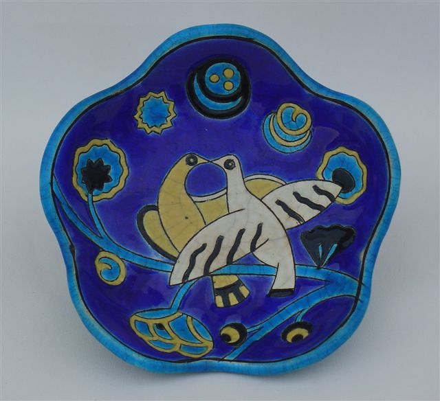 CENDRIER à bords ondulants. Décor aux deux colombes stylisées émaillées jaune pâle, et noir entourées de motifs stylisés, sur fond bleu foncé. Bordure et revers émaillés turquoise.