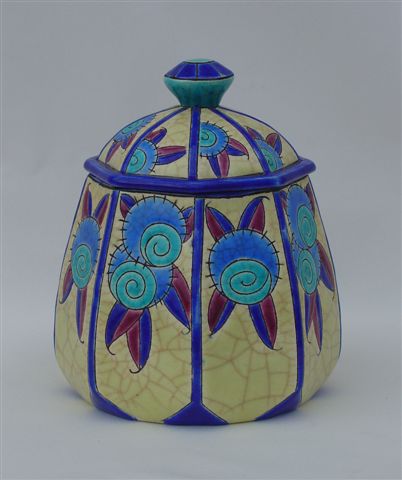 POT COUVERT à pans. Décor de fleurs stylisées bleu deux tons, vert et bordeaux, sur fond jaune pâle craquelé. Pans à filets bleu. Prise du couvercle bouton vert et bleu foncé. Marque manuscrite D 5038.