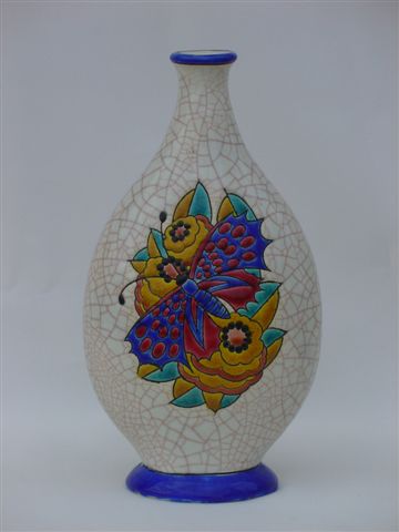 VASE ovoïde à panse aplatie. Décor de fleurs et d'un papillon stylisés sur fond crème craquelé. Talon et col à bordure bleue. Marque manuscrite D 5072.