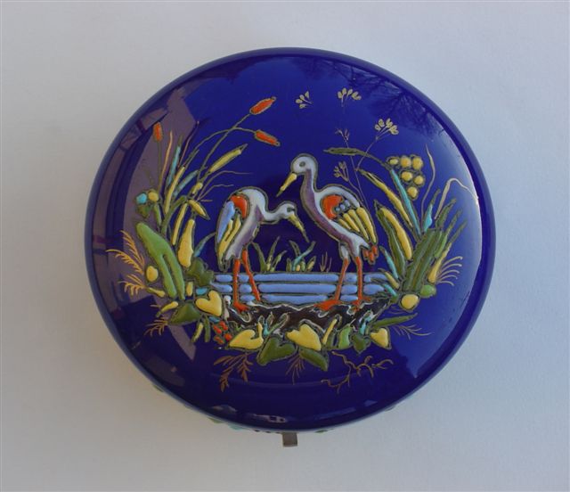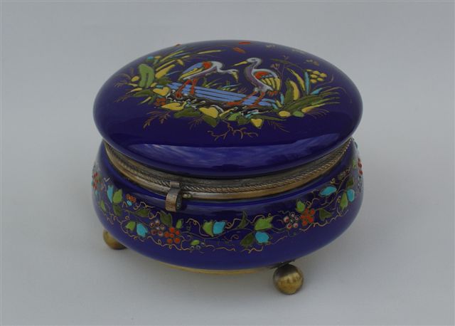 BONBONNIÈRE bombée en bleu de Sèvres finement décorée d'application d'émail cerné d'or. Montée sur trois pied boules en bronze et un cercle en bronze réunissant les pieds. Couvercle à décor polychrome émaillé aux échassiers. Frise feuillagée sur le corps. Rehauts d'or. Fond "bleu de Sèvres" (1880-1895). Technique de E.Ernie.