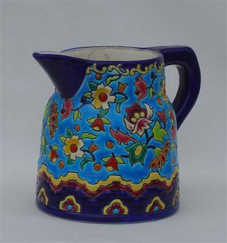 PICHET. Décor plein de fleurs polychromes sur fond bleu. Anse et bec verseur bleu foncé. Marque manuscrite D 5900 K et F 3376.
