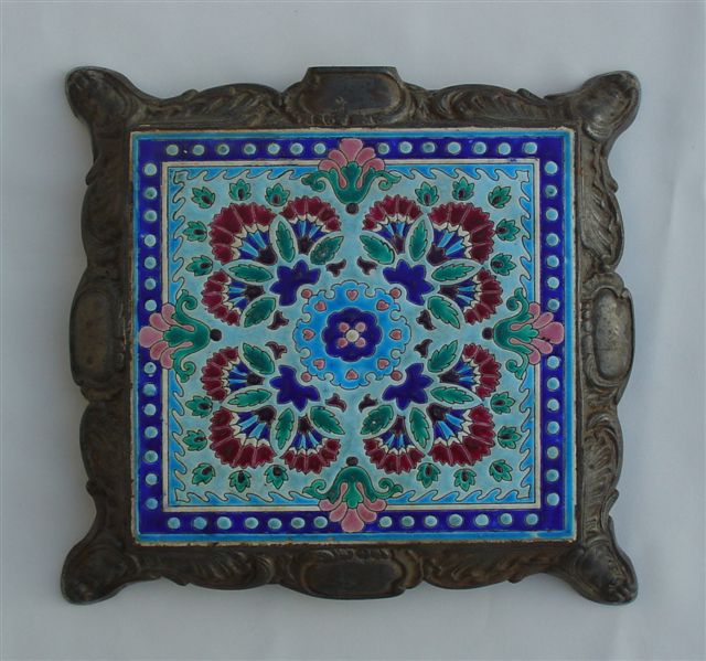 DESSOUS-DE-PLAT. Monture métallique quadripode feuillagée à cartouche. Décor quadrilobé bordeaux, vert, bleu deux tons et rose, sur fond bleu céruléen.