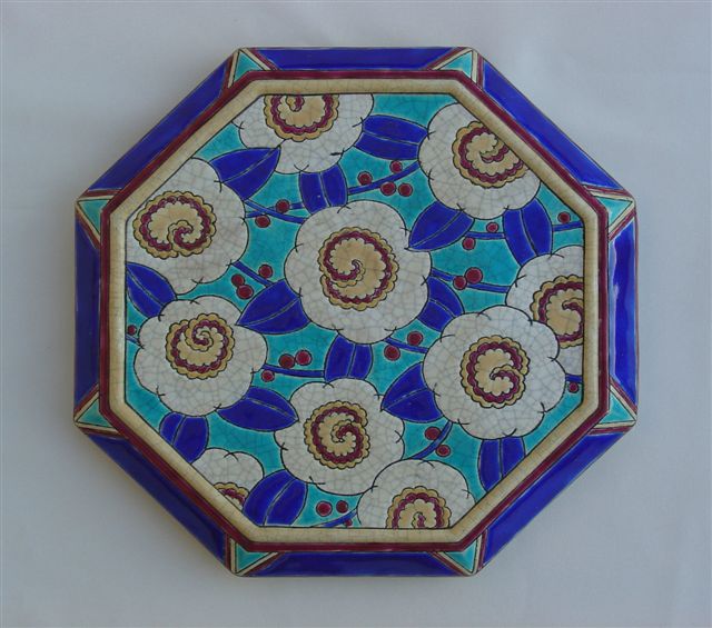 DESSOUS-DE-PLAT hexagonal. Décor stylisé de fleurs sur fond turquoise. Marque manuscrite 5251.