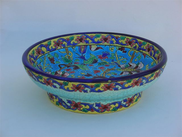 COUPE sur piédouche à bords relevés. Décor de feuillage et de fleurs d'orchidées sur fond bleu. Bordure intérieure et extérieure, et talon à guirlande fleurie sur fond jaune. Extérieur bleu céruléen craquelé.