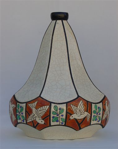 VASE TOUPIE à facettes. Décor tournant aux oiseaux sur fond caramel et de rameaux d'oliviers alternés sur fond crème craquelé. Huit facettes crème craquelé cernés de noir.