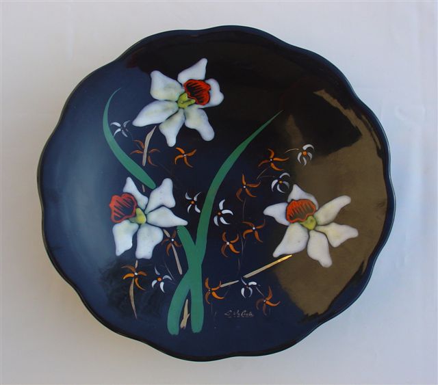 COUPE sur piédouche signée L. VALENTI. Décor de trois jonquilles sur fond noir. Bordure ondulante.